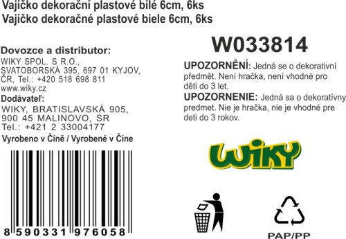 Vajíčko dekorační plastové bílé o velikosti 6 cm. 6 ks na proložce. Cena za proložku.