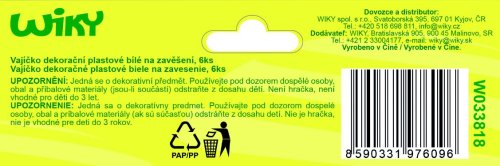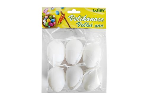 Vajíčko dekorační plastové bílé na zavěšení o velikosti 6 cm. 6 ks v balení. Cena za jedno balení.