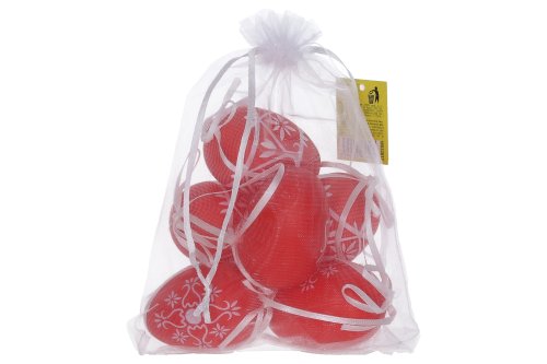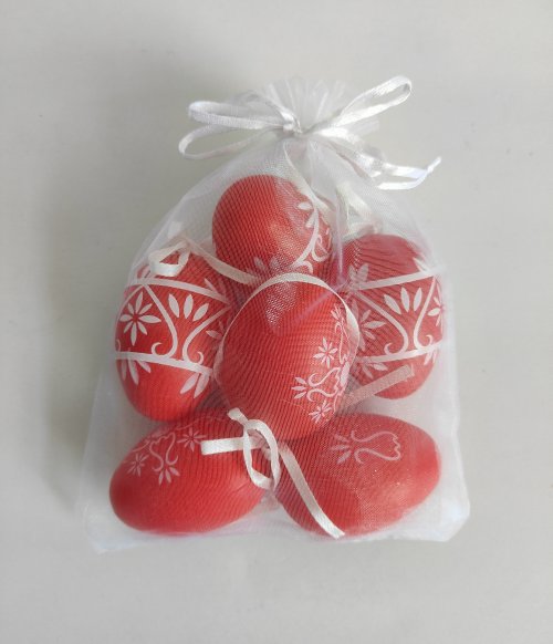 Vajíčko dekorační plastové červené o velikosti 6 cm. 6ks v organza sáčku. Cena za jeden organza sáček.