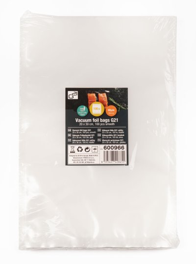 Hladké vakuovací sáčky G21 o rozměrech 20 x 30 cm jsou díky své vysoké pevnosti a kvalitnímu provedení vhodné nejen pro prodloužení trvanlivosti potravin vakuováním a jejich uchovávání v ledničce nebo v mrazáku, ale využijete je i k vakuování surovin pro sous-vide vaření.