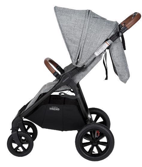 Novinkou kočárku Trend 4 je polohovací rukojeť. Rukojeť i ochranné madlo jsou potažené ekologickou kůží, která kočárku propůjčuje luxusní vzhled. Ochranné madlo, které zároveň slouží jako pojistka před dítětem, lze otevírat z obou stran.
