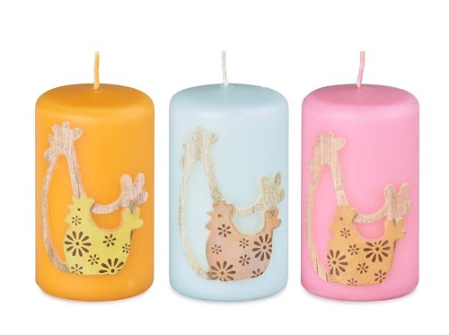 Dekorativní svíčka ve tvaru válce o velikosti 50×80 mm je ozdobena roztomilou aplikací slepičky, která jí dodává typicky velikonoční a hravý vzhled. Barevný mix umožňuje snadné zakomponování do jarních aranžmá, košíčků či výzdoby svátečního stolu. Svíčka působí příjemně a v interiéru vytváří útulnou atmosféru. Je skvělou volbou jako drobný dárek nebo stylový doplněk velikonoční dekorace. Zboží je dodáváno v mixu. Doručované zboží je vybíráno náhodně a nelze vybrat konkrétní provedení.