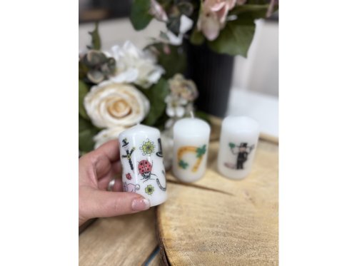 Tato originální svíčka ve tvaru válce je ozdobena oblíbenými symboly pro