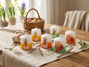Válec o rozměru 70×80 mm s máčenou svíčkou a dekorativní aplikací motivu kraslice a beránka. Jednotlivé kusy jsou dodávány v mixu barev a detaily se mohou mírně lišit.
