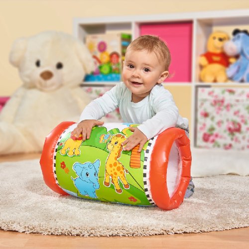 Nafukovací válec s potiskem zvířátek, ze stran průhledný, uvnitř 2 chrastící kuličky. Rozměry cca 44 x 25 cm.