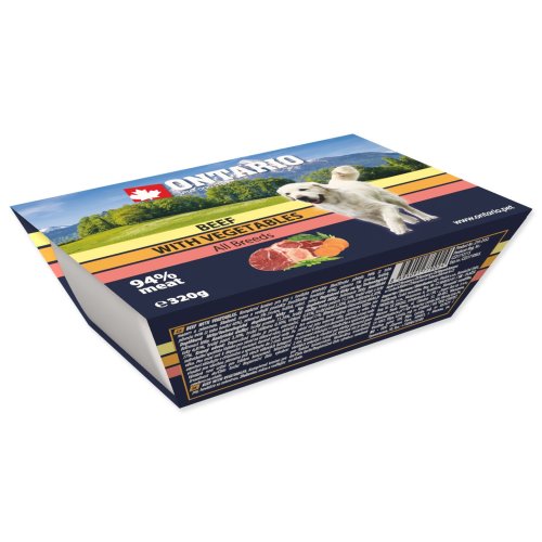 Složení: maso a vedlejší produkty živočišného původu 94% (z toho hovězí 40%), zelenina 5% (mrkev, hrášek, celer).
