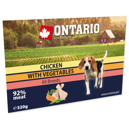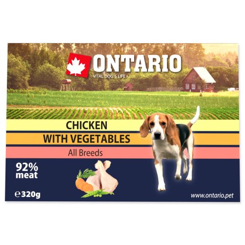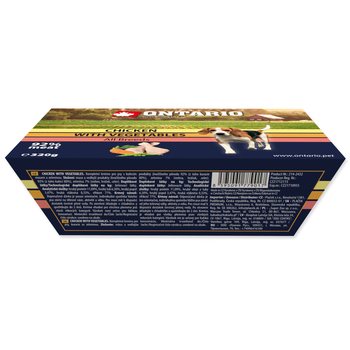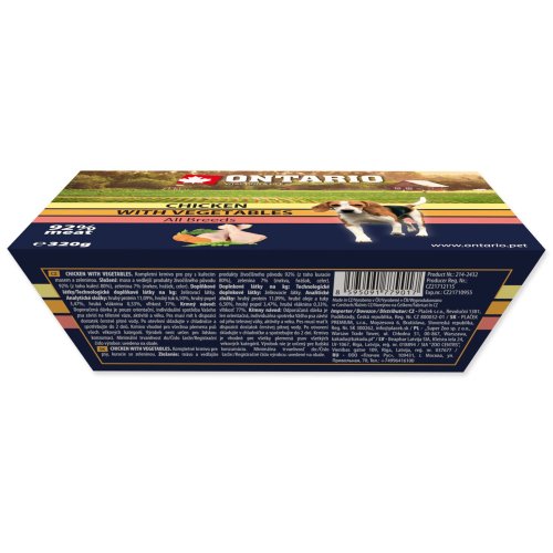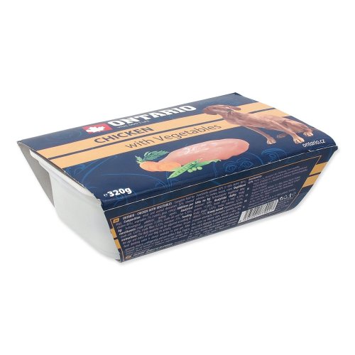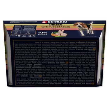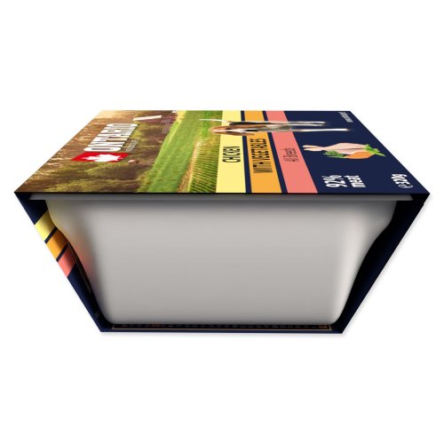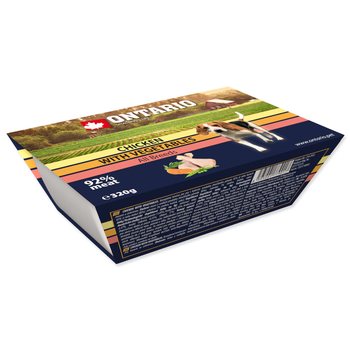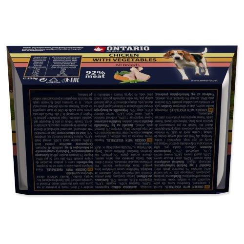Složení: maso a vedlejší produkty živočišného původu 92% (z toho kuřecí 80%), zelenina 7% (mrkev, hrášek, celer).