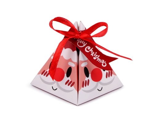 Vánoční krabička pyramida zaujme děti i dospělé. Nahoře se ozdobně zavazuje pomocí přiložené stužky. Součástí balení je i přivazovací vlaječka Merry Christmas. Krabičku můžete použít na drobné dárky nebo ji naplnit dobrotami na Mikuláše. Dodáváme ji v rozloženém stavu (17,5 x 17,5 cm). Složíte ji jednoduše podle vyznačených ohýbacích krajů. Krabička nemá atest na potraviny, pochoutky a jiné laskominy doporučujeme vložit zabalené v sáčku.