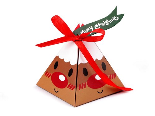 Vánoční krabička pyramida zaujme děti i dospělé. Nahoře se ozdobně zavazuje pomocí přiložené stužky. Součástí balení je i přivazovací vlaječka Merry Christmas. Krabičku můžete použít na drobné dárky nebo ji naplnit dobrotami na Mikuláše. Dodáváme ji v rozloženém stavu (17,5 x 17,5 cm). Složíte ji jednoduše podle vyznačených ohýbacích krajů. Krabička nemá atest na potraviny, pochoutky a jiné laskominy doporučujeme vložit zabalené v sáčku.