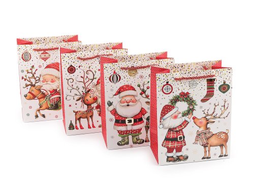 Sada vánočních dárkových tašek Santa se sobem je ideální volbou pro balení vašich nejrůznějších vánočních překvapení. Hodí se pro různé velikosti dárků, od menších po středně velké předměty, ať už se jedná o oblečení, knihy, kosmetiku nebo hračky. Ušetří vám spoustu času při balení. Jsou vyrobené z kvalitního pevného křídového papíru. Přední strana je ozdobená potiskem se zlatými metalickými detaily, zadní strana má barevný potisk, na bocích je potisk pleteniny. Ucha tašky jsou z kroucené saténové šňůry.