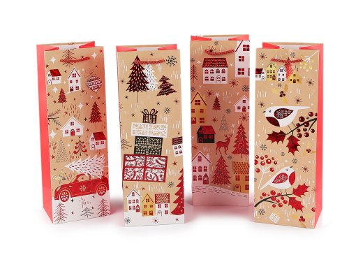 Sada vánočních dárkových tašek je určená na zabalení lahví a jiných podlouhlých dárků. Tašky jsou dostatečně vysoké, ať už se rozhodnete pro dárek s alkoholem nebo s domácí limonádou, tašky vám ušetří čas při balení. Jsou vyrobené z kvalitního pevného křídového papíru. Přední strana je ozdobená potiskem s metalickými detaily, zadní strana má barevný potisk, boky jsou jednobarevné. Ucha tašky jsou z kroucené saténové šňůry.