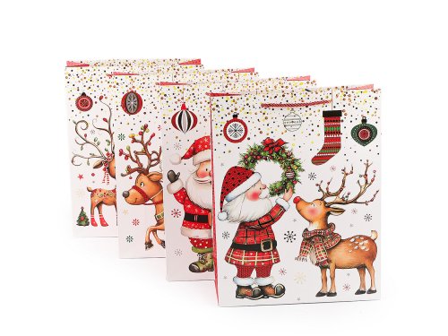 Sada vánočních dárkových tašek Santa se sobem je ideální pro balení větších předmětů, ať už jde o hračky, oblečení nebo různé dekorace. Ušetří vám spoustu času při balení. Jsou vyrobené z kvalitního pevného křídového papíru. Přední strana je ozdobená potiskem se zlatými metalickými detaily, zadní strana má barevný potisk, na bocích je potisk pleteniny. Ucha tašky jsou z kroucené saténové šňůry.