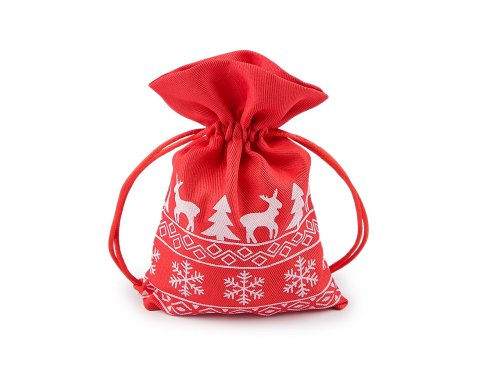 [Vánoční dárkový pytlík je z obou stran ozdobený potiskem sobů, stromečků a vloček. Můžete ho použít na dárky nebo ho naplnit mikulášskou nadílkou, ušetří vám čas při balení. Dá se naaranžovat i jako vánoční dekorace. Stahuje se pomocí kulatých saténových šňůrek, dárku dodá osobní kouzlo a půvab.]