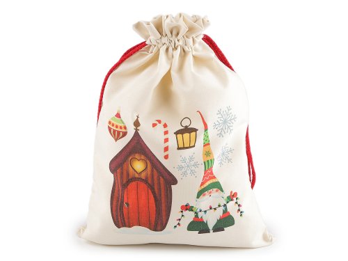Dárkový pytlík je ideálním řešením pro stylové balení vánočních dárků. Díky jeho velikosti do něj můžete dát větší a objemnější věci. Uzavírá se pomocí stahovacích šňůrek. Potisk je jednostranný.