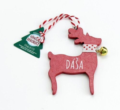Dřevěné dekorace se jmény či texty lze použít nejen jako ozdobičku na stromeček, ale i jako stylovou jmenovku na dárek. S rolničkou a okrasnou stužkou. Sobíci pro ženy, bílí medvědi pro muže.