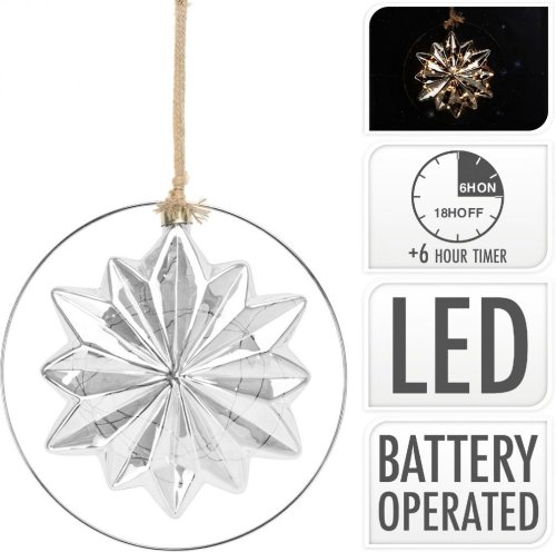 Vánoční dekorace hvězda svítící kouřově šedá, 18.5X8X21.5CM, vzdálenost žárovek 5 cm, přívodní kabel 80 cm, provoz na 3 x AA baterie (nejsou součástí balení), časovač 8 hod. zapnuto / 16 hod. vypnuto