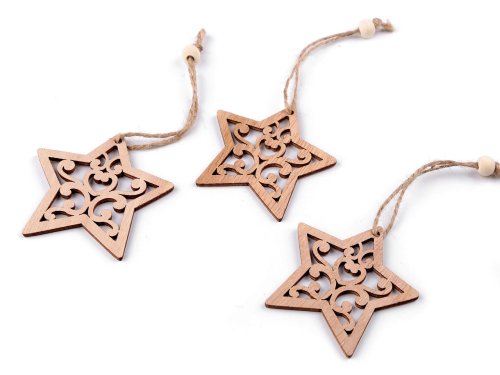 Dřevěné vánoční dekorace[ mají přírodní dřevěný povrch] s krásnou přirozenou strukturou. Díky připevněnému poutku z juty a korálků je můžete pověsit na stromek, na dveře, do oken nebo volně do prostoru. Budou se vyjímat i jako ozdoba na slavnostně zabaleném dárku.
