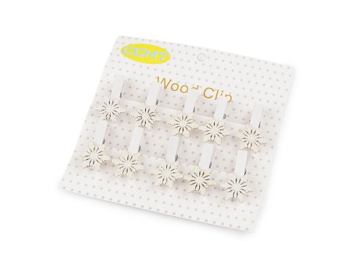 Dřevěné kolíčky s vločkou stylově ozdobí dárky, dárkové tašky nebo květináče a květinové vazby. Jsou vhodné i na výrobu adventního kalendáře. Vločky jsou pokryté třpytivými glitry.