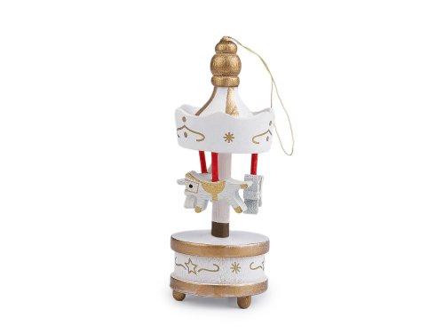 Dřevěný miniaturní kolotoč ozdobí vánoční stromeček, větvičky ve váze i dekorační věnce. Působí roztomile a má poutavě zpracované detaily. Evokuje vzpomínky na dávné časy a vnáší do domova kouzlo tradic.