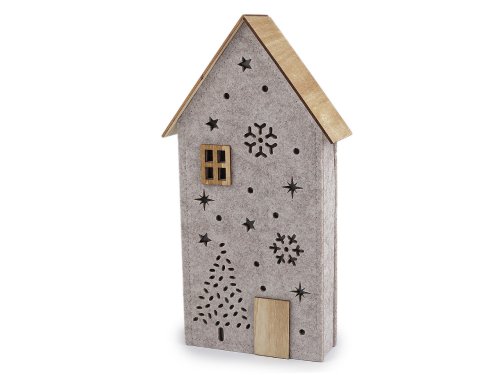 Svítící dekorační domeček má základ z pevného filcu a střechu a detaily ze dřeva. Ze přední strany má výřezy v podobě vloček, hvězdiček a stromečku. Svítí příjemným teplým světlem. Zútulní každý interiér. Baterie (2x CR2032) jsou součástí balení.
