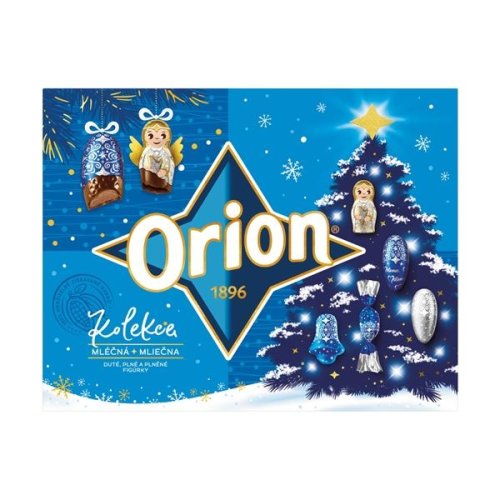 Orion mléčná kolekce Plné, duté a plněné figurky z mléčné čokolády a máčené fondánové salonky Hmotnost: 347 g