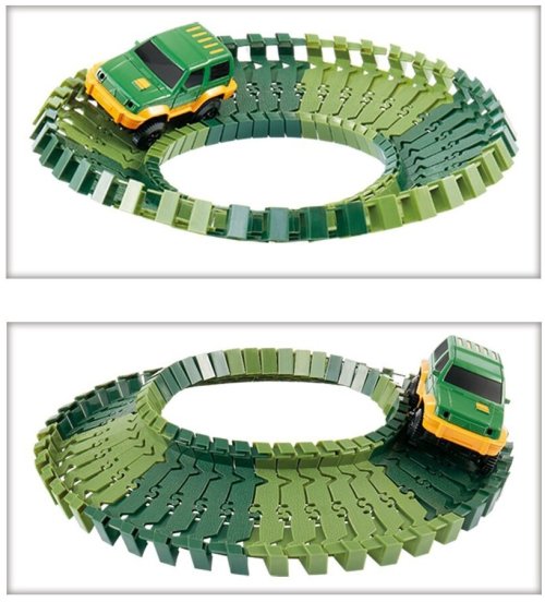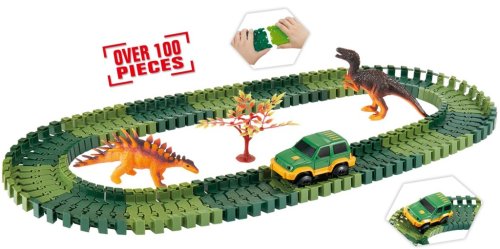 Balení obsahuje: variabilně sestavitelnou dráhu, 3 pravěká zvířata, strom, svítící autíčko 9,5 × 5,5cm. Provoz autíčka na 2×1,5V AA baterie – nejsou součástí balení.