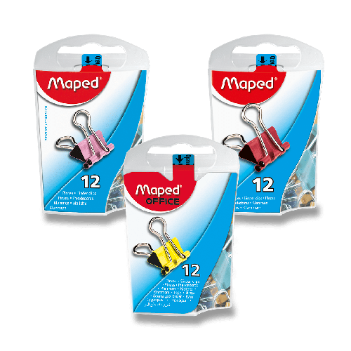 Kancelářské kovové klipy (binder clips), barevné. Velikost 15 mm, 12 ks. Mix barev.