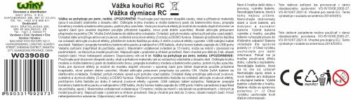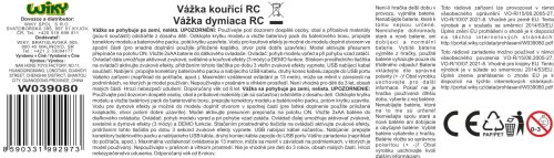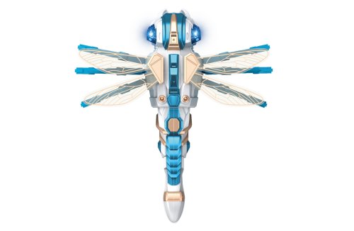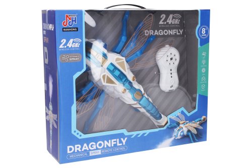 Vážka kouřící RC na dálkové ovládání. Rozměry 33x32x7,5 cm. Frekvence 2.4GHz. Světelné, zvukové a kouřové efekty. Tlačítka na ovladači - chůze dopředu, dozadu zatáčí, 3 módy kouřových efektů, 2 demo režimy, zvuk. 3.7V bateriový pack do vážky součástí, 2xAA do ovladače nejsou součástí. Přepínač ON/OFF na spodní straně vážky. Nádržka na vodu na spodní straně hlavy. USB kabel, nádobka na vodu součástí.