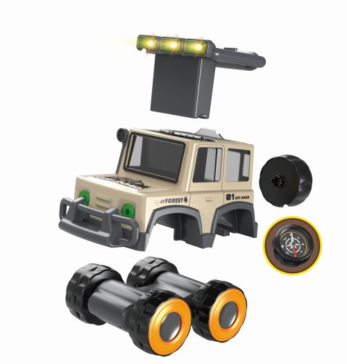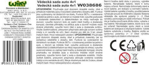 Vědecká sada auto 4v1. Rozměry auta 19,5x11,5x13,5 cm. Dalekohled (kola auta), kompas, svítilna, odkládací prostor. 3xAAA baterie do auta nejsou součástí.