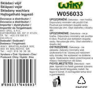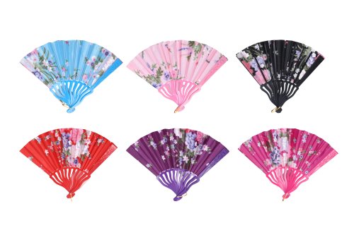 Vějíř skládací o délce 23 cm. 6 barevných variant: fialový, růžový, levandulový, červený, černý, modrý.