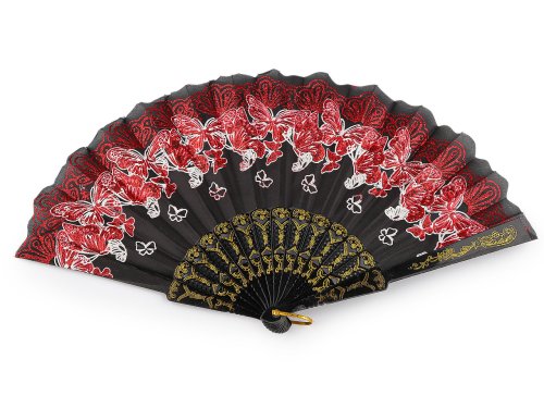 Textilní vějíř zdobí potisk motýlů, který je doplněný třpytivými glitry. Využijete ho na společenské události, na karnevaly i různá taneční vystoupení. Rukojeť je plastová s poutkem. Vějíř se může stát elegantním doplňkem pro večerní procházky nebo dovolenou v exotických destinacích. Je nejen módním doplňkem, ale i praktickým pomocníkem v horkých letních dnech. Přinese vám příjemné osvěžení a zvýrazní váš osobní styl.