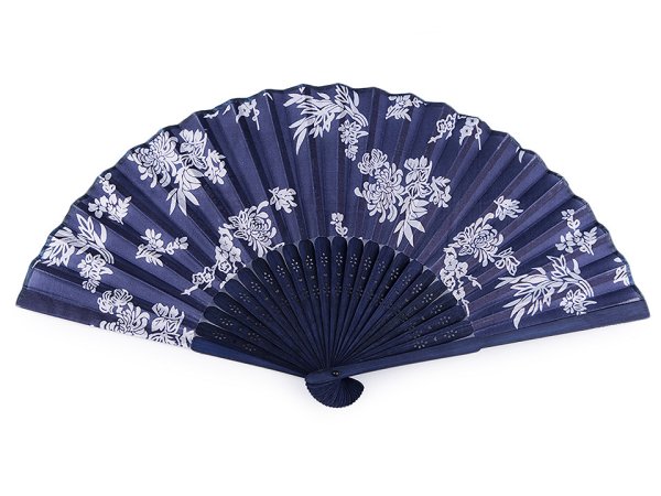 Vějíř využijete na společenské události i na karnevaly. Zdobí ho květinový potisk. Má dřevěnou rukojeť s vyřezanými ornamenty. Květinový potisk se může lišit.