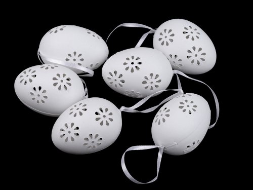 Velikonoční vajíčka s děrovaným designem vám ozdobí věnce, větvičky ve váze apod. Jsou lehoučká, mají poutko ze saténové stuhy. Můžete je ponechat [jednobarevná], nebo je pomalovat dle svého vkusu.