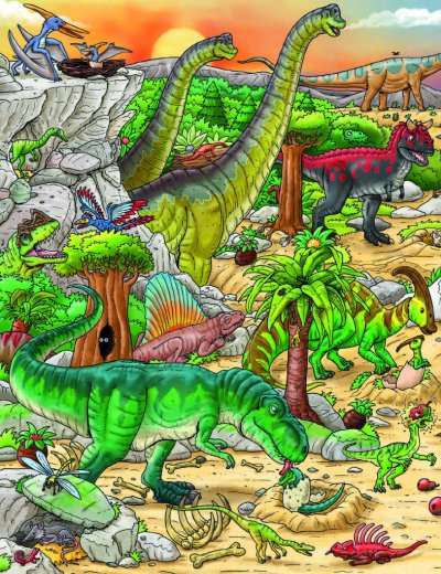 V pravěku to na zemi vypadalo úplně jinak než dnes. A hlavně tu nežili lidé! Svět byl královstvím veleještěrů zvaných dinosauři, kteří obývali všechna myslitelná prostředí. Někteří žili na souši, jiní pod vodní hladinou a teritoriem dalších byl zase vzdušný prostor. Jednotlivé druhy se proto od sebe hodně lišily. Tahle knížka vám představí pravěký svět dinosaurů v celé jeho kráse a rozmanitosti. Poznáte druhy, které létaly, plavaly, lezly, běhaly… Když se budete dobře dívat, odhalíte dokonce to, jak se jedni dinosauři bránili útokům druhých, čím se živili nebo jak přicházela na svět jejich mláďata. Někteří z ještěrů jsou vyobrazeni na každé stránce – vyzkoušejte svůj postřeh a hledejte je znovu a znovu na krásných barevných obrázcích plných roztodivných pravěkých tvorů! Na konci knihy pak najdete kompletní seznam názvů vyobrazených dinosaurů – naučte se je znát a staňte se odborníky přes tyto oblíbené pratvory!