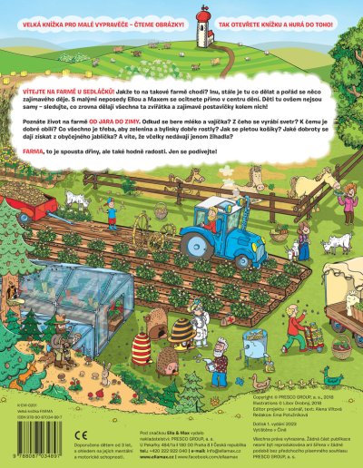 Seznamte se s rodinou Sedláčkových z farmy pod lesem, kde to žije celý rok, od jara do zimy. <br> <br> VÍTEJTE NA FARMĚ U SEDLÁČKŮ! Jakže to na takové farmě chodí? Inu, stále je tu co dělat a pořád se něco zajímavého děje. S malými neposedy Ellou a Maxem se ocitnete přímo v centru dění. Děti tu ovšem nejsou samy – sledujte, co zrovna dělají všechna ta zvířátka a zajímavé postavičky kolem nich! <br> <br> Poznáte život na farmě OD JARA DO ZIMY. Odkud se bere mléko a vajíčka? Z čeho se vyrábí svetr? K čemu je dobré obilí? Co všechno je třeba, aby zelenina a bylinky dobře rostly? Jak se pletou košíky? Jaké dobroty se dají získat z obyčejného jablíčka? A víte, že včelky nedávají jenom žihadla? <br> <br> <br> Knihy ilustrátora Libora Drobného jsou charakteristické svou hravostí, vtipem a jedinečným, lehce rozpoznatelným stylem, utvářeným detailními pestrobarevnými ilustracemi. Toto původní české dílo bude základním kamenem každé dětské knihovničky. <br> <br> FARMA, to je spousta dřiny, ale také hodně radosti. Jen se podívejte!