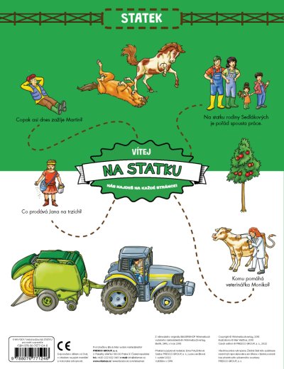 Vítejte na statku rodiny Sedlákových. Tahle velká obrázková knížka vás provede všemi kouty hospodářství a vy tu prožijete celý úžasný den! Poznáte zvířata, která zde žijí, lidi nejrůznějších profesí, kteří tady pracují a pomáhají. Budete sledovat impozantní zemědělské stroje při práci a také se bavit, třeba na jezdeckém turnaji nebo na koncertě. Některé postavičky a zvířátka můžete hledat na každé dvojstránce znovu a znovu a sledovat jejich příběhy. Je to docela fuška, ale hlavně velké dobrodružství a zábava!