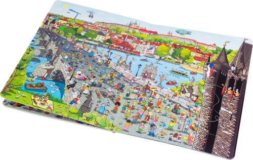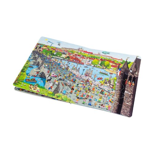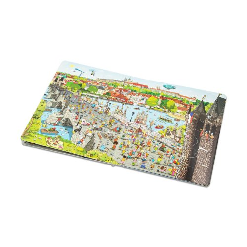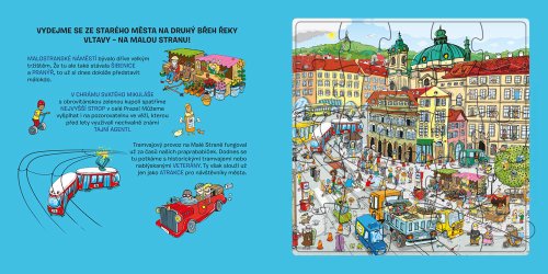 Velká knížka PRAHA. Jako modrý had se mezi pražskými kopci vine řeka Vltava překlenutá mnoha mosty a lávkami. Tím nejstarším, nejkrásnějším a nejznámějším je KARLŮV MOST. O letních prázdninách je na mostě pěkná tlačenice! Z mostu je překrásný pohled na Pražský hrad. Hrad je obrovský! Patří k největším na světě. Vydáme-li se tím směrem, nemůžeme minout MALOSTRANSKÉ NÁMĚSTÍ s chrámem svatého Mikuláše. I tam je pěkně rušno, obzvláště když po studené zimě vykoukne jarní sluníčko. A půjdeme-li z mostu na druhou stranu, dorazíme do centra města – na nejstarší a nejvýznamnější náměstí Prahy – STAROMĚSTSKÉ NÁMĚSTÍ s krásnou radnicí a magickým orlojem. A když přicházejí Vánoce, to je teprve kouzlo! Ale Praha, to nejsou jen domy, mosty a chrámy. Tak například STROMOVKA, to je jedno velké hřiště a nejen pro děti...!