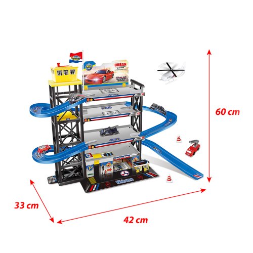 Teď už budeš mít všechna svá auta pohromadě! Sada obsahuje garáž se 4 podlažími, 1 helikoptéru a 3 autíčka. Nelze vybrat konkrétní druhy. Vhodné pro děti od 4 let. Rozměr garáže po sestavení je 42 x 60 x 33 cm. Velikost autíček je cca 7 - 8 cm. Upozornění: Garáž balena v náhradním obalu, viz fotografie.