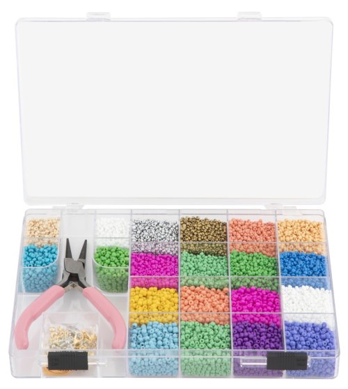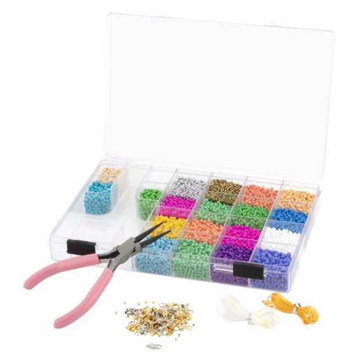 Velká sada korálků na výrobu šperků obsahuje – 20 barev korálků, kleštičky, zlaté a stříbrné zapínání a spojky + zlaté a stříbrné lanko k navlékání.
