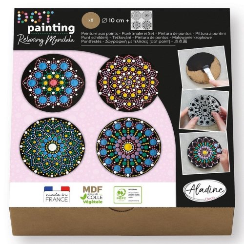 Kreativní sada obsahuje všechno potřebné pro velké tečkovací tvoření! Najdete v ní 8 kulatých dřevěných výřezů, které nabarvíte na černo pomocí plochého štětce a podkladové barvy. Po zaschnutí na výřez přiložte jednu ze 4 plastových šablon s kulatými otvory. V balení je dále mikrotužka, s níž se všechny otvory šablony překreslí – díky nim budete vědět, kde na výřezu udělat jak velké tečky. Nyní si stačí otevřít 8 přiložených barviček a můžete tečkovat! Pro velké tečky využijte akrylové tyčinky, pro malé tečky nástroje s kovovými kuličkami. Můžete následovat vzory na balení nebo tečkovat dle vlastní fantazie. Šablony lze používat opakovaně, je možné dokoupit další dřevěné výřezy (zn. Gomille). MDF pochází z ekologicky získaného zbytkového dřeva.