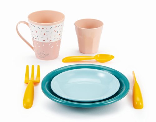 Sada nádobí obsahuje talíře, talířky dezertní, misky, hrníčky, kelímky a příbory. Celkem obsahuje 32 ks. Baleno v praktické krabici s otvory pro snadný přenos na zahradu, na návštěvu atd. Krabice zároveň slouží i jako servírovací stolek.