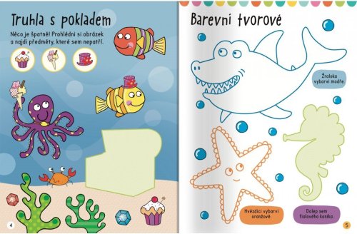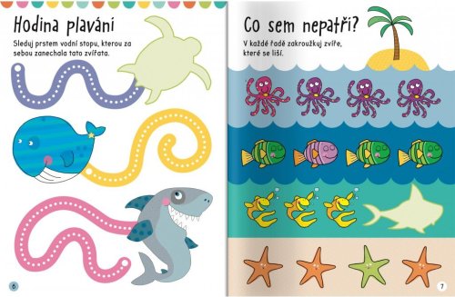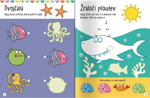 Ponoř se pod hladinu mezi rozverné žraloky! V této knížce plné aktivit a her na tebe čeká spousta úkolů a výzev. Spojuj stejné živočichy, hledej rozdíly, procvič si psaní a počítání či pomoz žralokovi najít cestu za kamarádem. Dolepuj samolepky, vybarvuj obrázky a doplňuj! Tento sešit s roztomilými samolepkami a vytlačovacím podmořským pexesem ti zajistí plno zábavy!
