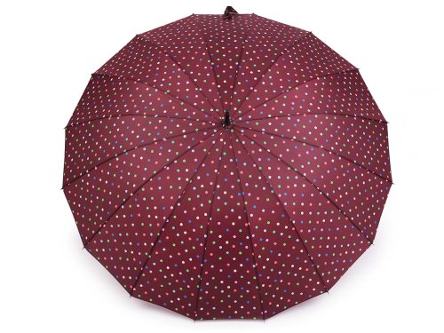 [Velký vystřelovací deštník s puntíky] vás spolehlivě ochrání před nepřízní počasí. Skládá se z 16 polí. Díky jeho velkému průměru[ 117] cm je vhodný jako deštník pro dva (rodinný deštník). Konstrukce je vyrobená z pružných lamel zajišťujících vysokou pevnost a stabilitu. Deštník má klasickou tyč zakončenou pevnou rukojetí. Hloubka deštníku je [28] cm.
