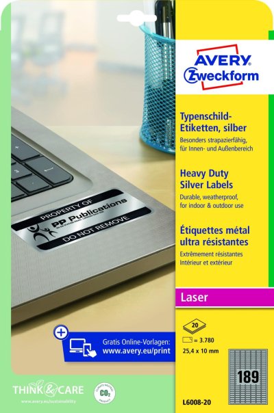 • Stříbrné polyesterové etikety jsou odolné vůči stříkající vodě, nečistotám, mastnotě, roztržení, stárnutí, UV záření a teplotám od -40°C do +150°C