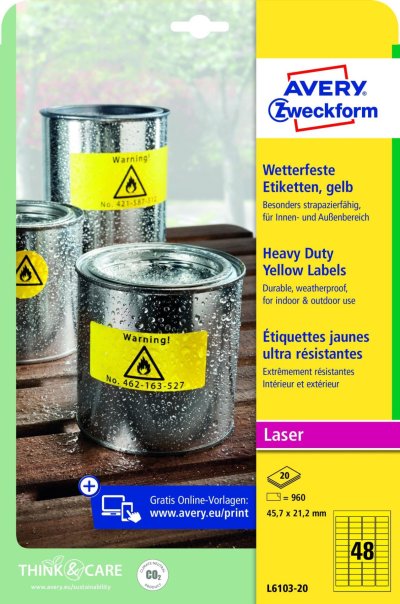 • Žluté polyesterové etikety jsou odolné vůči stříkající vodě, nečistotám, mastnotě, roztržení, UV záření a teplotám od -20°C do +80°C