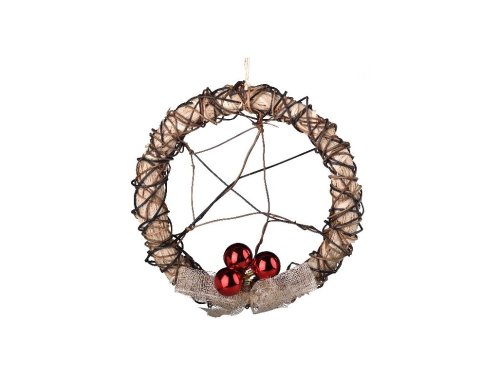 Věnec o průměru 300 mm je zdoben červenými ozdobami a proplétaným středem, který dodává dekoraci hloubku a zajímavý vizuální efekt. Ideální pro vánoční výzdobu, zavěšení na dveře, stěnu nebo jako součást stolního aranžmá. Věnec vytváří slavnostní a útulnou atmosféru.