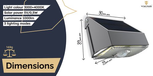 Technické specifikace světla: •Model: Venkovní solární LED světlo s pohybovým senzorem Viking SR11 •Svítivost: 1000 lm •Barva světla: 3000k+4000K, Ra>70 •Typ světla: LED (OSRAM) 2835, 20ks •Doba osvětlení za nevhodných podmínek: >3 dny Režim ovládání: tlačítko, ON/OFF stisknutím na 1,5s
