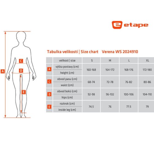 Sportovní kalhoty ETAPE Verena WS jsou ideální volbou pro ženy, které hledají pohodlné a funkční kalhoty na cyklistiku, běhání či jen běžné nošení při teplotách od -15 °C do 5 °C. Kalhoty jsou vyrobené z funkčního a elastického materiálu SoftShell, který je odolný větru a vodě s vynikajícími termoizolačními a transpiračními vlastnostmi. Díky třívrstvé struktuře nabízí maximální komfort a ochranu. Navíc díky materiálu ThermoFit kalhoty nabízí skvělé thermoizolační vlastnostni, jsou elastické, měkké, příjemně na dotek a mají antibakteriální úpravu. Verena WS: - materiál SoftShell s membránou a zateplením - materiál ThermoFit se zateplením - pohodlný volný střih - elastický pas s tkanicí na stažení - 2 kapsy na zip - zipy na nohavicích pro pohodlné oblékání - protiskluzový silikonový pásek na nohavicích - reflexní bezpečnostní prvky - teplotní rozsah: -15 °C až 5 °C Velikostní tabulka v obrázcích. Uvedené hodnoty jsou pouze orientační a vhodná velikost se může lišit dle konkrétního typu postavy.