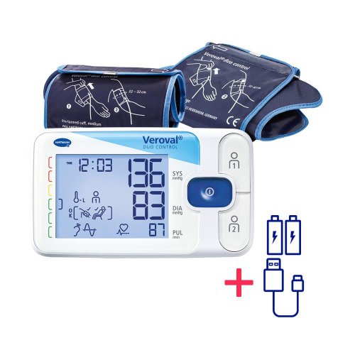 Výhody pažního tlakoměru Veroval® duo control Patentovaná technologie Duo Sensor využívá 2 metody měření pro přesné výsledky jako u lékaře, takže si vždy správně změříte tlak, i když trpíte srdeční arytmií. Chytrá manžeta Secure fit s technologií Comfort Air zajistí, že si tlak změříte správně a pohodlně. Vyberte si ze 2 velikostí: M, nebo L. Na špatně nasazenou manžetu vás na displeji upozorní i sám tlakoměr, stejně tak kontroluje, zda jste při měření v klidové pozici. Tlakoměr je plně automatický, s velkým, podsvíceným displejem a intuitivním ovládáním. Kapacita paměti ukládá až 100 měření zvlášť pro 2 osoby, umí navíc měřit v režimu "návštěva" a výsledky měření propojí s aplikací Veroval® medi.connect.
