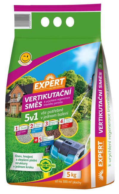 Vertikutační směs slouží k obnově a regeneraci travního porostu po vertikutaci. Vertikutační směs je vyrobena ze zeolitu, speciálního trávníkářského písku, organického hnojiva ve formě mikrogranulátu, travního osiva a vododržné složky (půdního kondicionéru). Použité travní osivo se skládá z vybraných druhů rychle klíčících trav, což vede k rychlému zaplnění prázdných míst v trávníku. Složení: NPK 3 - 1 - 5. Organické hnojivo dodává vzcházejícímu travnímu porostu všechny potřebné živiny a díky velmi jemné granulometrii je docíleno pravidelného rozmístění hnojiva, což má příznivý vliv na rovnoměrný růst a tvorbu kořenového systému. Tím je dosaženo rychlé obnovy chybějícího travního porostu. Zeolit pomáhá zlepšit využití živin z hnojiva, protože má schopnost poutat přebytečné živiny a následně je postupně uvolňovat pro potřeby rostlin. Pro zdárné klíčení travního osiva a vzcházení mladých rostlin je rovněž nezbytné zajistit dostatek vláhy, protože mladé vzcházející rostliny jsou z důvodu nedostatečně vyvinutého kořenového systému náchylné k jejímu nedostatku. Z tohoto důvodu je součástí vertikutační směsi i vododržná složka, která má schopnost vázat vodu v době jejího nadbytku (dešťové srážky, závlaha) a potom ji postupně uvolňovat rostlinám. Tím se zlepšuje využití vody ze závlahy (dešťových srážek).